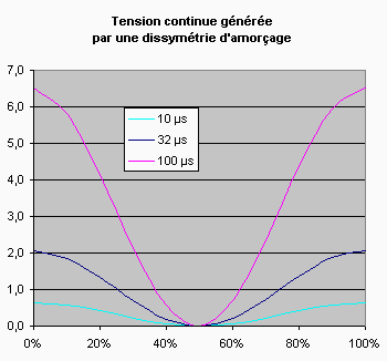 L'instant d'amorçage est considéré classiquement comme identique pour l'arche positive et négative. Si une dissymétrie à l'amorçage apparaît, une tension continue est générée. Cette tension est sans danger pour les lampes, et autres charges résistives, mais il n'en va pas de même pour les charges inductives comme un moteur ou un transformateur. Dans ces cas, une tension continue va créer un champ constant qui va magnétiser le circuits magnétique.Cette tension est faible, 2 Volts max avec une dissymétrie de 30µs.