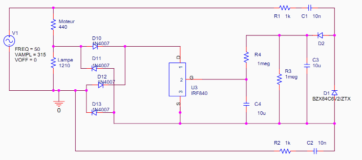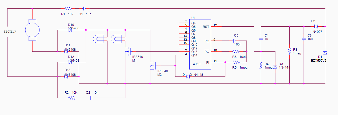 Le pont de diodes D10-D13 sera dimensionné par tenir la tension secteur, soit 600V et le courant pic. On prendra des 1N5408 (1000V/3A). Des 1N4007 (1000V 1A) sont un peu limite, elles risquent de chauffer un peu et de ne pas tenir le pic.
