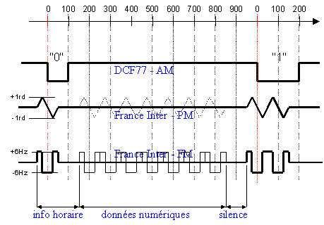Les deux émetteurs utilisent le même code horaire, mais ils l'expriment en utilisant un codage différent ; la modulation du DCF77 est en amplitude, celle de France Inter est en phase (ou en fréquence). La modulation de phase est de +/- 1 radian, avec une pente de +/- 40