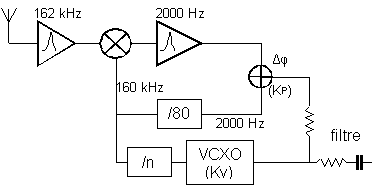 Le VCO doit avoir une plage de capture extremement faible, car sinon, à la mise en route, il n'y aura jamais de signal en sortie du filtre 2kHz. On peut parler d'une plage de capture de l'ordre de +/-200 Hz autour de 160kHz soit de l'ordre de 0.1%. Avec de telles valeurs, un VCO analogique (4046, 567) n'est pas adéquat, et seul un VCXO peut garantir cette très faible plage de capture.