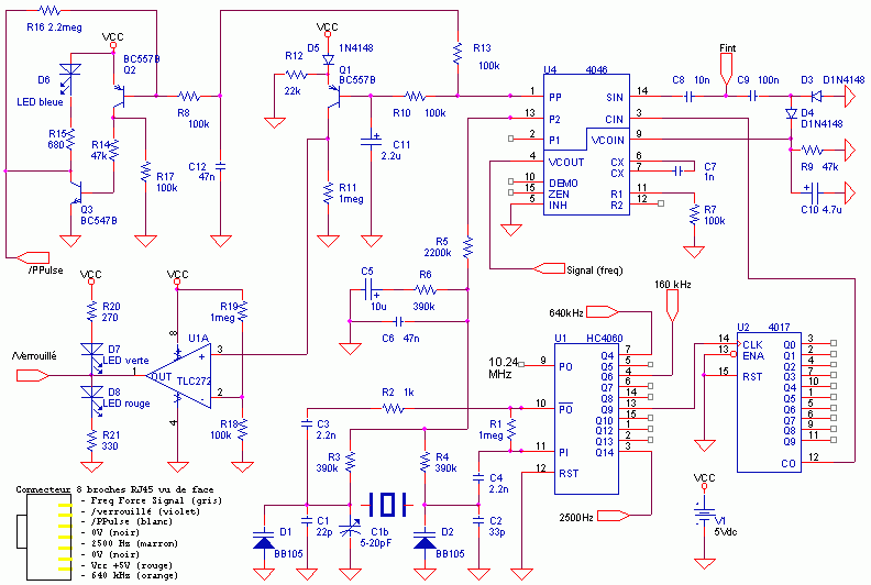 Le VCO de la PLL 4046 est utilisé pour convertir en fréquence la force du signal reçu avec un transfert de l'ordre de 50 Hz/Vcrete. Ce signal fréquenciel est facile à mesurer avec un µcontrolleur ou un PC voire à écouter avec un écouteur, et permet ainsi simplement de régler l'antenne.