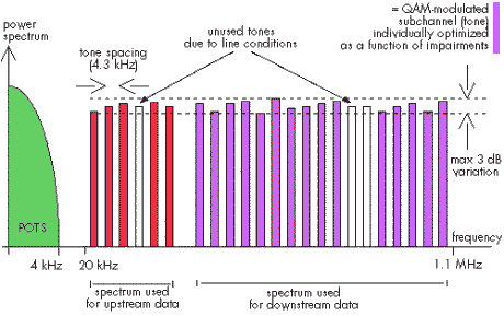 A noter que les sous-canaux 16 et 64 sont utilisés pour transporter un signal pilote et que les canaux 250 à 256 sont utilisables que sur des lignes de raccordement de faible longueur. Au dessus de 1 MHz, les perturbations sont trop grandes pour permettre un flux stable.
