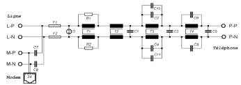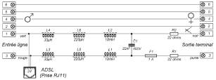 Zblocker filter, ref Z-200FR Excelsius Tech Inc C'est basique, la sortie ADSL n'est même pas filtrée en continu, un passe bas simple pour le combiné téléphonique. |